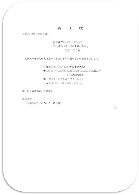 弁護士を宛名人にして「今後の手続きは表記代理人に一任します」という内容のものです。この委任状によって、面倒な裁判所書記官からの質問の受け答えから、必要書類の確認、提出すべてを代理して行ってもらうために必要な書類です。弁護人は申立人と裁判所を赤い橋で繋ぐ役割です。
